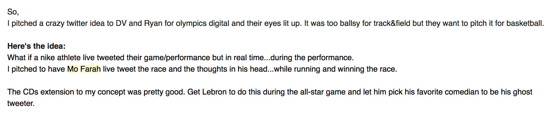 I pitched this a few years ago to the Nike CDs. I still believe that even now it would feel fun and fresh.